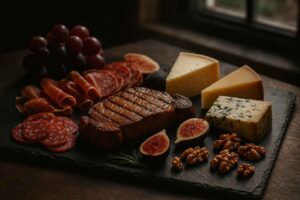 Charcuterie board with cheeses, cured meats, grapes, figs, and walnuts on a slate board