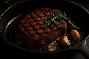 Medium-rare grilled steak with rosemary, garlic, and butter on a cast iron skillet